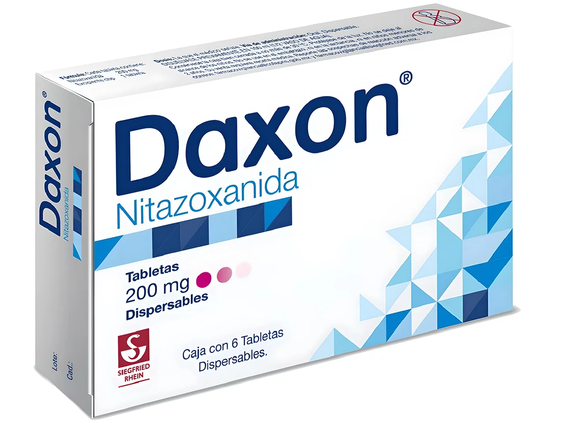 Please consult your physician before taking any medication. Tablets Dispersible Tablets Nitazoxanide PHARMACEUTICAL FORM AND FORMULATION Made the mixture, 100 ml contain: Nitazoxanide ......................... 2.0 g Excipient, C.S. Each tablet contains: Nitazoxanide ...................... 500 mg Excipient, c.b.p. One tablet. Each dispersible tablet contains: Nitazoxanide ...................... 200 mg Excipient, c.b.p. One tablet. THERAPEUTIC INDICATIONS Acute intestinal amebiasis and amebic dysentery caused by Entamoeba histolytica. Daxon is indicated for the treatment of giardiasis caused by Giardia lamblia. Helminthiasis: Daxon is an anthelmintic effective against nematodes, cestodes and trematodes, indicated for the treatment of Enterobius vermicularis, Ascaris lumbricoides and Strongyloides stercoralis. Necantor americanus, Ancylostoma duodenale, Trichuris trichiura, Taenia saginata, Taenia solium, Hymenolepis nana and Fasciola hepatica, Isospora beli, Cryptosporidium parvum. Amebic liver abscess. Daxon is indicated for the treatment of symptomatic trichomoniasis in women and men. In women with confirmed presence of Trichomonas vaginalis in the laboratory. Asymptomatic Trichomoniasis when the body is associated with endocervicitis, cervicitis and cervical erosion. PHARMACOKINETICS AND PHARMACODYNAMICS Daxon (nitazoxanide) is rapidly absorbed in the intestinal tract, undergoing rapid metabolism by acetyl chain oxidation of 2 - (1-hydroxy-N-(5-nitro 2-tiazol/benzamida). The maximum concentration (Cmax of 1.9 mcg / ml) (Tmax 2-6 hours) Daxon (nitazoxanide) may be detected in blood 2 hours after administration of a single dose of 500 mg. The main metabolite excreted unchanged in urine within 24 hours. In Trichomonas vaginalis, Giardia lamblia and Entamoeba histolytica, the electron resonance studies have shown that biochemical and ferridoxin pyruvate oxidoreductase (PFOR) and hydrogenase less intensity, reduce ferridoxina, which is oxidized by the nitro group of T position on compounds like Daxon nitroheterocíclicos (nitazoxanide). In these organisms, Daxon (nitazoxanide) is reduced to a toxic radical in an organelle in the metabolism of carbohydrates, Hydrogenosome, which contains hydrogenase and ferridoxina PFOR. CONTRAINDICATIONS Nitazoxanide is contraindicated in patients with a history of hypersensitivity to the active. Do not administer to children under two years. GENERAL PRECAUTIONS Patients with gastrointestinal disorders should take the medicine with food, because it can increase their discomfort. RESTRICTIONS OF USE DURING PREGNANCY AND LACTATION Mutagenicity studies using the Ames and micronucleus test, showed no mutagenic activity of nitazoxanide Daxon. Reproduction studies in rats and rabbits at doses of 200 and 201 times the usual dose in humans, respectively, showed no evidence of teratogenicity, embryotoxicity and phototoxicity. The use of this drug in pregnancy and breastfeeding is the responsibility of the physician, assessing the risk benefit. ADVERSE REACTIONS The most commonly reported adverse reactions are at the gastrointestinal tract, particularly nausea, some 8% of patients, sometimes accompanied by headache, anorexia and occasionally vomiting and nonspecific epigastric distress and abdominal cramps. This produces changes in the color of your urine. If amber color persists, notify your doctor. DRUG INTERACTIONS AND OTHER GENDER The concomitant use of coumarin and warfarin may increase plasma levels and prolong the prothrombin time. CHANGES IN THE LABORATORY TEST RESULTS May present moderate increase in transaminases, moderate, which resolves after discontinuation of medication. PRECAUTIONS IN RELATION TO EFFECTS OF CARCINOGENESIS, MUTAGENESIS, teratogenesis and ON FERTILITY The Ames and micronucleus tests showed no teratogenic effects. The evidence on the mutagenic effects in Salmonella typhimurium were negative for mutagenic effects.